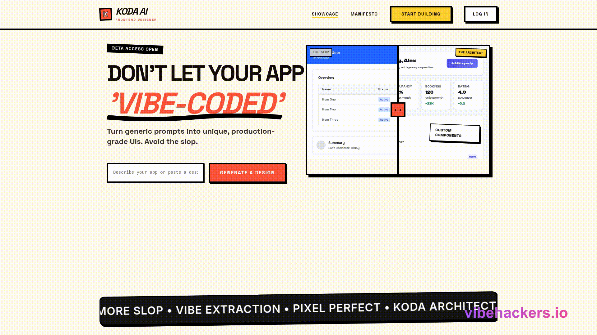 Koda is a design tool that transforms generic prompts into unique, production-grade user interfaces, helping to improve the quality of vibecoded designs and avoid generic AI outputs.