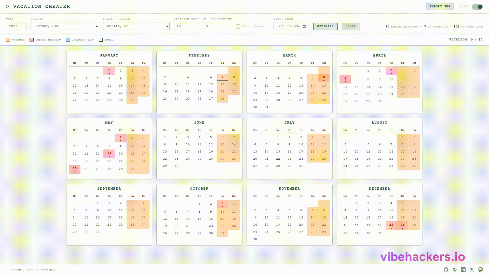 Vacation Cheater: Free tool to squeeze the most days off from your vacation budget. Finds bridge days between public holidays and weekends, optimizes placement with a greedy algorithm. Supports 100+ countries with regional holidays.