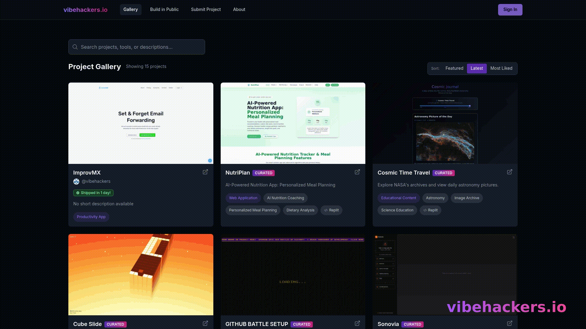 Vibehackers.io - Developer community platform for showcasing projects and building in public. Features collaborative tools, project galleries, and real-time sharing for developers to connect and showcase their work.